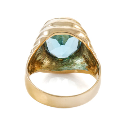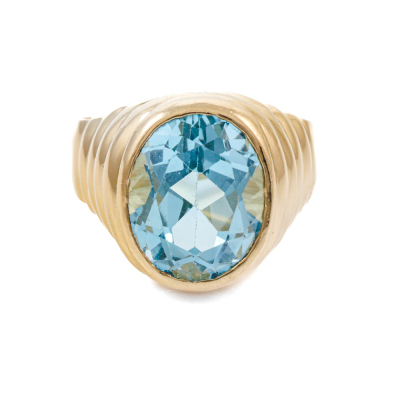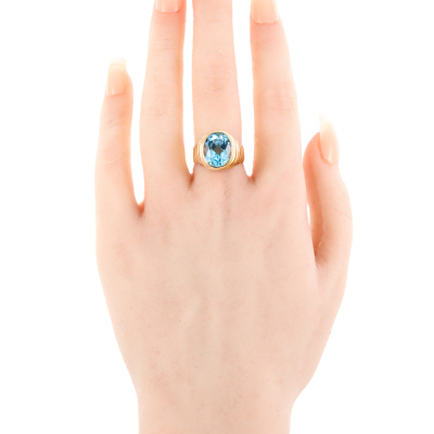 Topaz ring with oval shape light blue Natural Topaz of approximately 5.50ct. 18ct yellow gold. Ring size: M1/2. Band width: 3.8mm - 5.5mm. Weight: 10.5g. (Pre-owned)