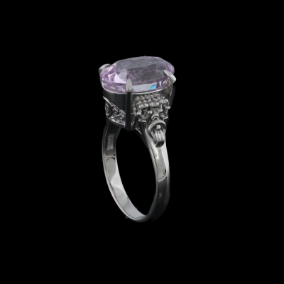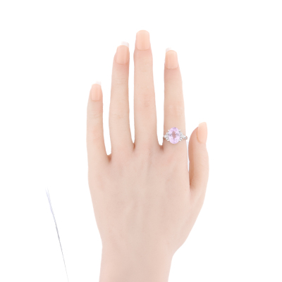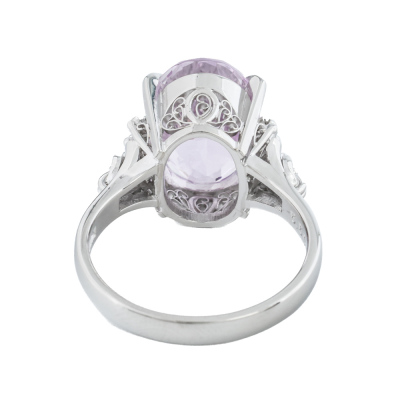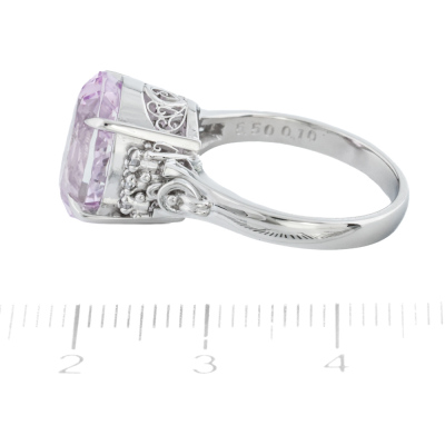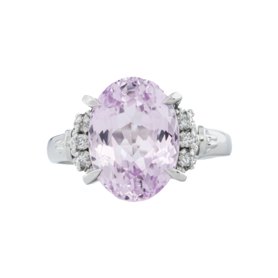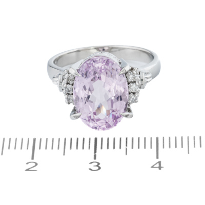 Kunzite and Diamond ring with centre oval shape Natural Kunzite of 5.50ct and 6 round Natural Diamonds totalling 0.10ct. Platinum-900. Ring size L3/4. Band width: 2.5mm - 2.7mm. Weight: 7.9g (Pre-owned)