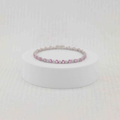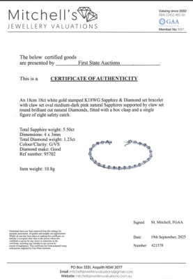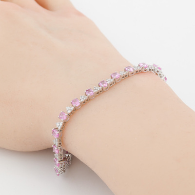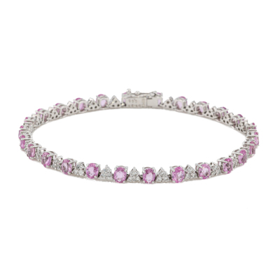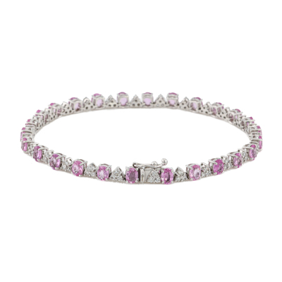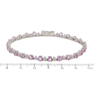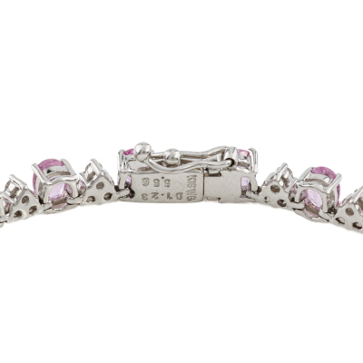 Sapphire and Diamond bracelet with oval shape Natural Pink Sapphires totalling 5.50ct and round Natural Diamonds totalling 1.23ct (Estimated grading: G VS). 18ct white gold. Length: 18cm. Weight: 10.8g. With Certificate #421578. (Pre-owned)