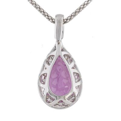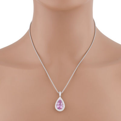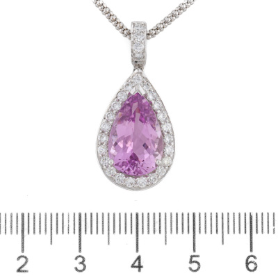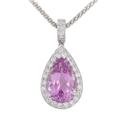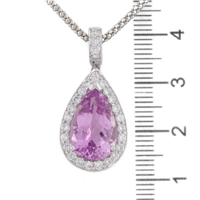 Kunzite and Diamond pendant with centre pear shape Natural Kunzite of 5.54ct and round Natural Diamonds totalling 0.65ct (Estimated grading: G VS). 18ct white gold with 45cm 18ct white gold adjustable chain. Weight: 9.4g