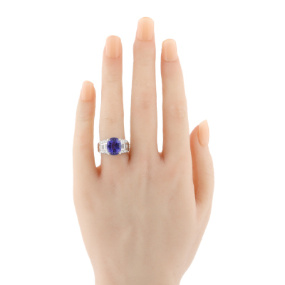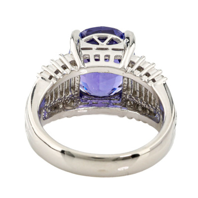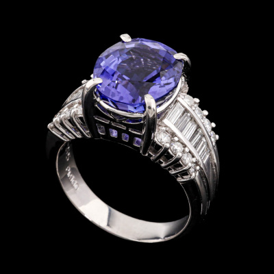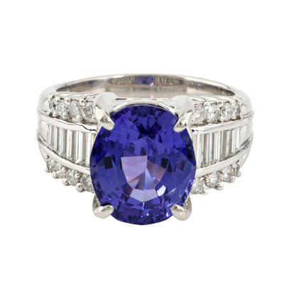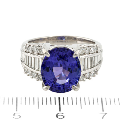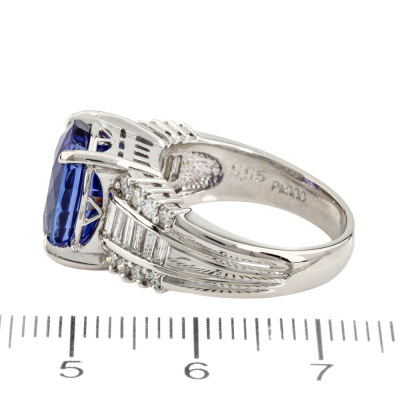 Tanzanite and Diamond ring with centre oval shape Natural Tanzanite of 5.55ct and round & baguette cut Natural Diamonds totalling 0.77ct (Estimated grading: G VS-SI). Platinum - 900. Ring size: K3/4. Band width: 3.6mm - 4.5mm. Weight: 12.1g. (Pre-owned)
