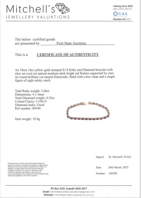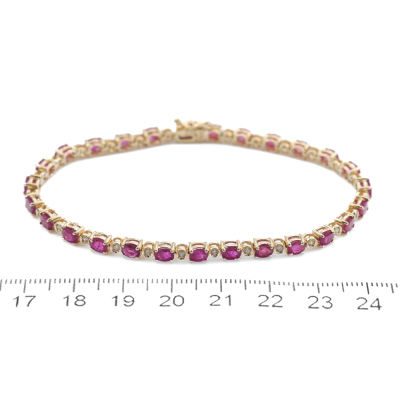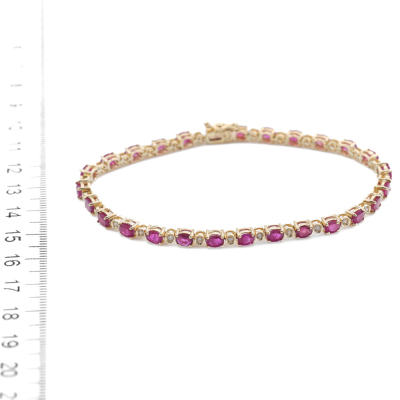 Ruby and Diamond bracelet with oval shape Natural Rubies totalling 5.60ct and round Natural Diamonds totalling 0.25ct. 18ct yellow gold. Length: 18cm. Weight: 10.8g. With Certificate #420288. (Pre-owned)