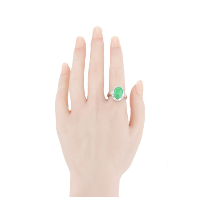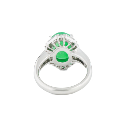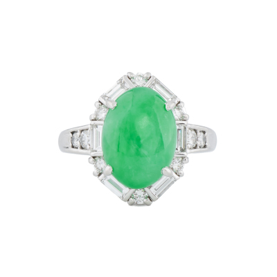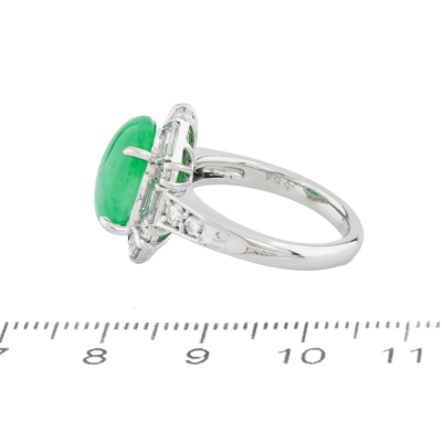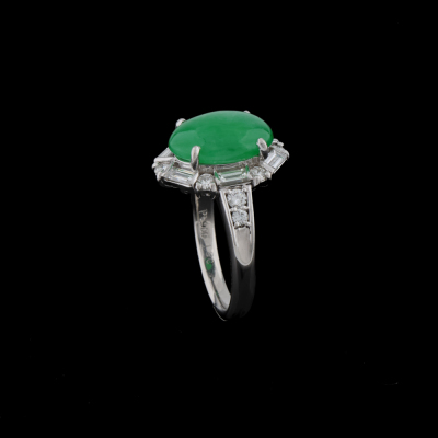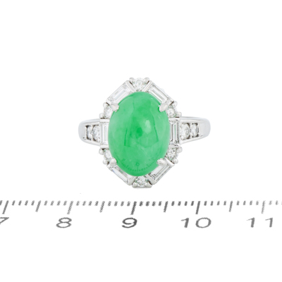 Jade and Diamond ring with centre oval cabochon cut Natural Green Jadeite Jade -Type A of 5.64ct and round & baguette cut Natural Diamonds totalling 1.20ct (Estimated grading: G VS). Platinum - 900. Ring size: M1/2. Band width: 2.7mm - 3.0mm. Weight: 10.8g. (Pre-owned)