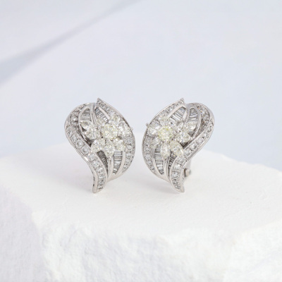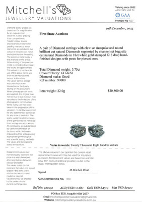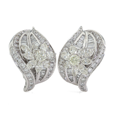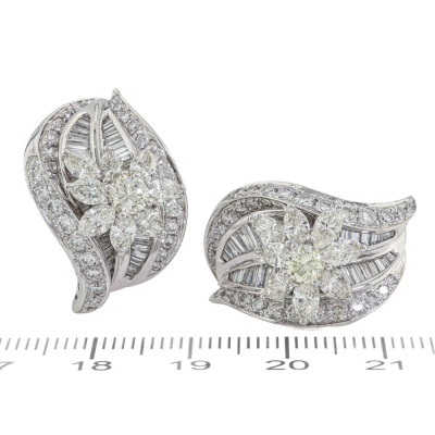 Clip-on earrings (with foldable posts for pierced and non-pierced ears) with round, marquise & baguette cut Natural Diamonds totalling 5.73ct (Estimated grading: GH-K SI). 18ct white gold. Weight: 22.0g. With Valuation Certificate #422251.