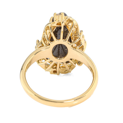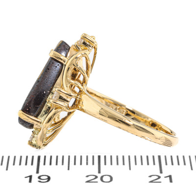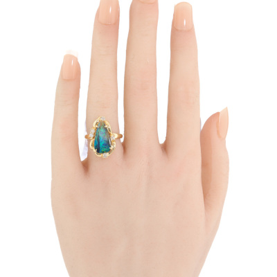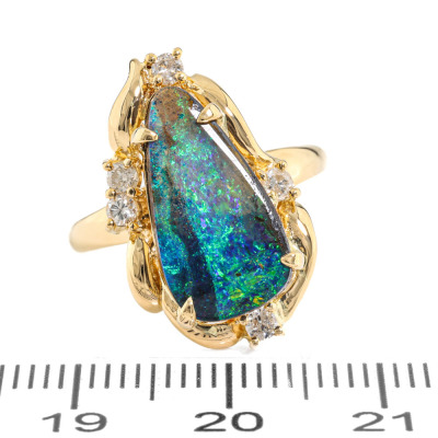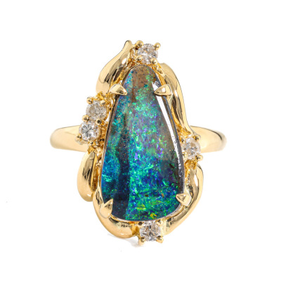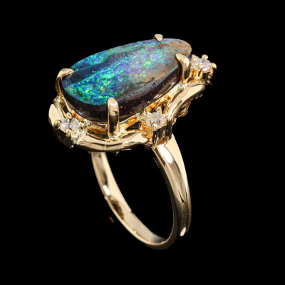 Opal and Diamond ring with centre solid Natural Boulder Opal of 5.78ct (15.8mm x 8.6mm) and 5 round Natural Diamonds totalling 0.21ct. 18ct yellow gold. Ring size L. Band width: 2mm-2.5mm. Weight: 6.6g. (Pre-owned)