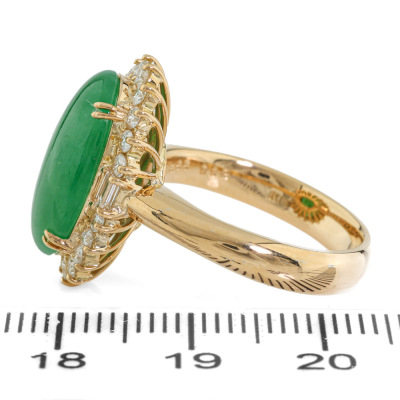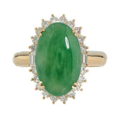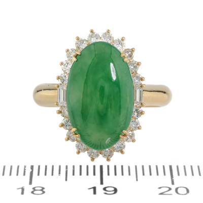Jade and Diamond ring with oval cabochon cut Natural green Jadeite Jade - Type A of 5.85ct and round & baguette cut Natural Diamonds totalling 0.62ct (Estimated grading: G VS). 18ct yellow gold. Ring size M. Band width: 3.7mm - 3.4mm. Weight: 9.5g. (Pre-owned)