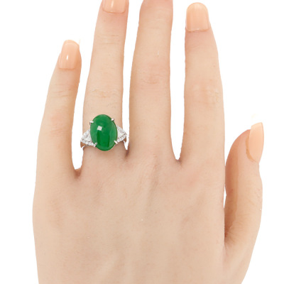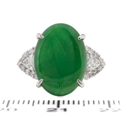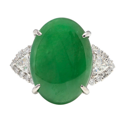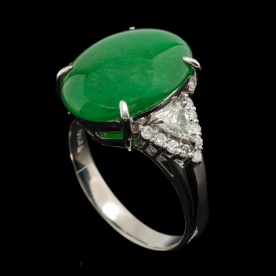 Jade and Diamond ring with oval cabochon cut Natural green Jadeite Jade - Type A of 5.87ct and round Natural Diamonds totalling 0.35ct (Estimated grading: G VS). Platinum - 900. Ring size K 1/4. Band width: 2.5mm - 3.2mm. Weight: 8.2g. (Pre-owned)