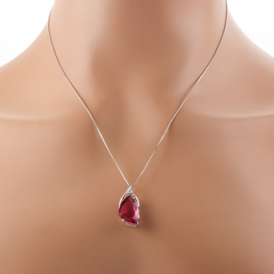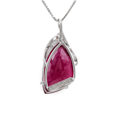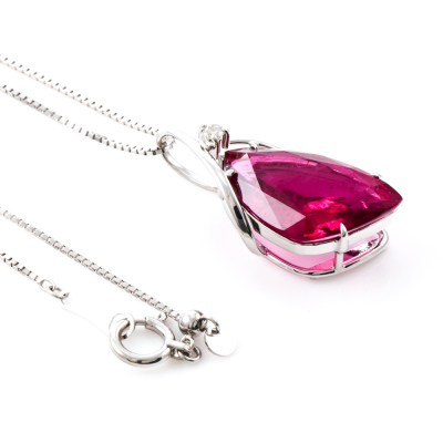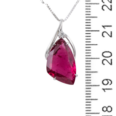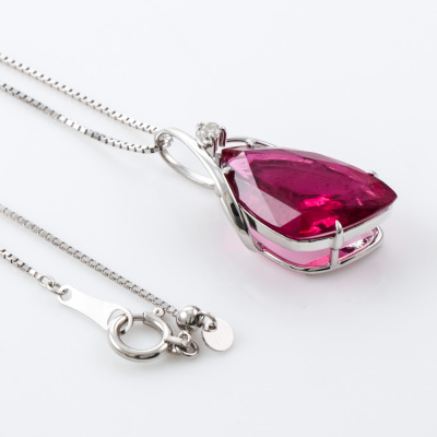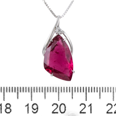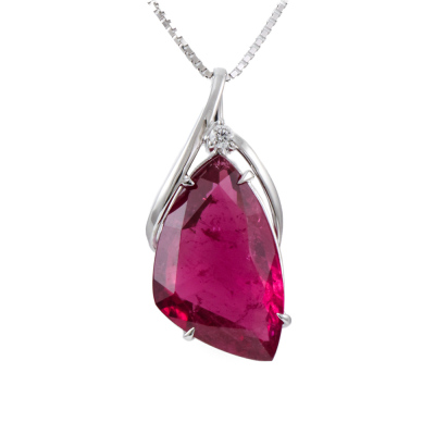 Rubellite and Diamond pendant with fancy trilliant cut Natural Rubellite of 5.95ct and a round Natural Diamond of 0.03ct. 14ct white gold (XRF tested, stamped 'K18WG') with 45cm 18ct white gold adjustable chain. Weight: 4.4g. (pre-owned)