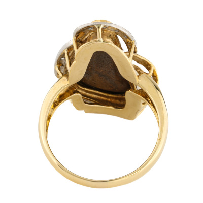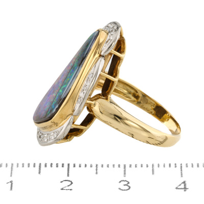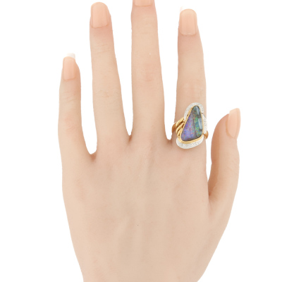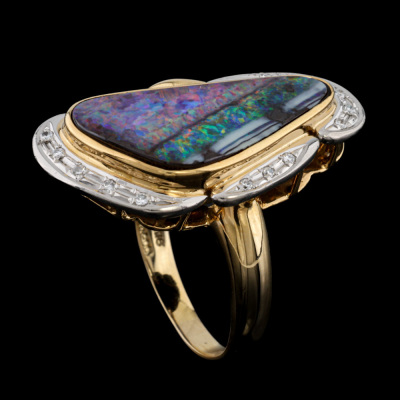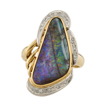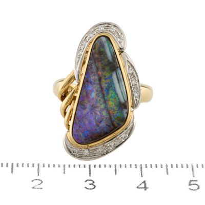 Opal and Diamond Ring with freeform solid Natural Boulder Opal of 5.98ct and round Natural Diamonds totalling 0.08ct. 18ct yellow gold. Ring size N 1/4. Band width: 2.4mm - 3.6mm. Weight: 8.6g. With Valuation Certificate dated 07/11/2025. (Pre-owned)
