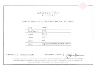 A loose round brilliant cut Natural Argyle Pink Diamond of 0.13ct (with Argyle Identification and Authenticity Report graded as 5PP SIAV Lot #376877). (As new)