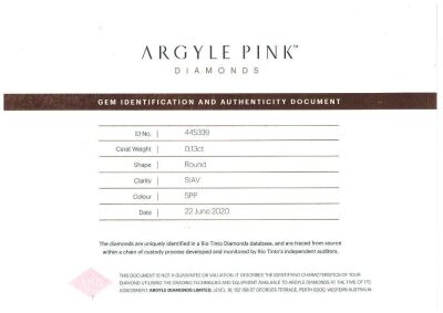 A loose round brilliant cut Natural Argyle Pink Diamond of 0.13ct (with Argyle Identification and Authenticity Report graded as 5PP SIAV Lot #445339). (As new)
