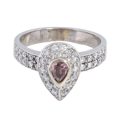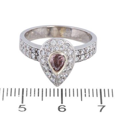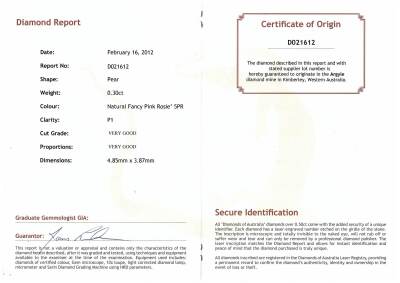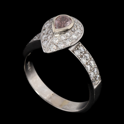 Diamond ring with centre pear shape Argyle origin Natural Pink Diamond of 0.30ct (With Diamond of Australian Report graded as 5PR - Natural Fancy Pink Rosie P1 #D021612. Origin: Argyle mine in Kimberley, Western Australia) and round Natural Diamonds totalling approximately 0.47ct (Estimated grading G VS). 18ct white gold. Ring size: O3/4. Band width: 3.6mm - 3.7mm. Weight: 7.7g. With GSL Valuation Report #AA50545 and box.