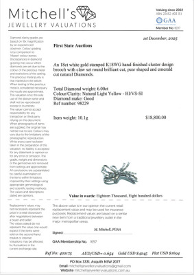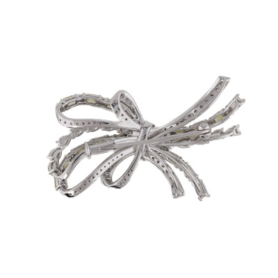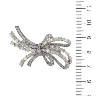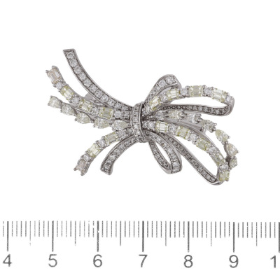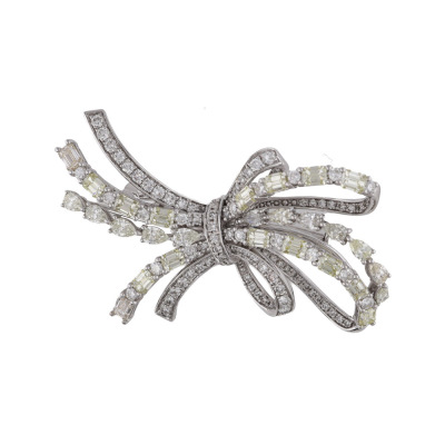 Bow design brooch with round, pear & emerald cut Natural Diamonds totalling 6.00ct (Estimated grading: Natural Light Yellow & H-I VS-SI). 18ct white gold. Size: 4.5cm x 2.5cm. Weight: 10.1g. With Certificate #422175.