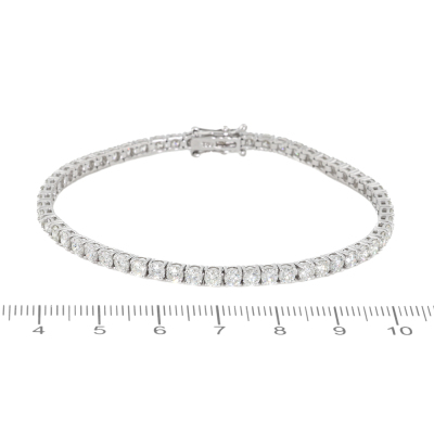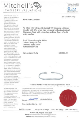 Diamond tennis bracelet with 57 round Natural Diamonds totalling 6.00ct (Estimated grading: H-I VS). 18ct white gold. Length: 18cm. Weight: 10.3g. With Valuation Certificate #421730. (New)