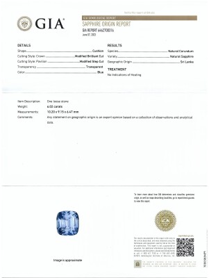 A loose cushion cut Natural Unheated Blue Sapphire of 6.02ct (with GIA report #6462700316, Origin: Sri Lanka). Measurements: 10.20mm x 9.15mm x 6.47mm. (As New)