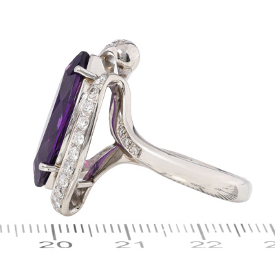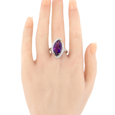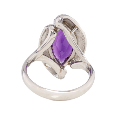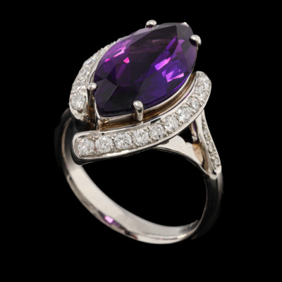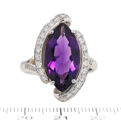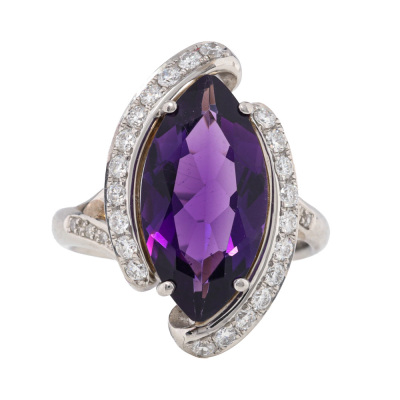 Amethyst and Diamond ring with centre marquise cut Natural Amethyst of 6.10 and round Natural Diamonds totalling 0.81ct (Estimated grading: H SI). Platinum - 900. Ring size S3/4. Band width: 3.8mm - 3.3mm. Weight: 15.8g. (Pre-owned)