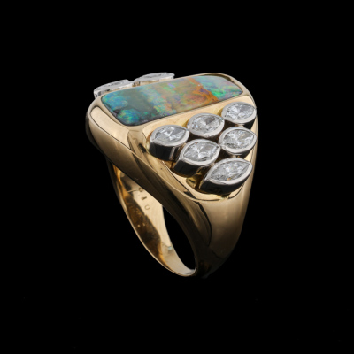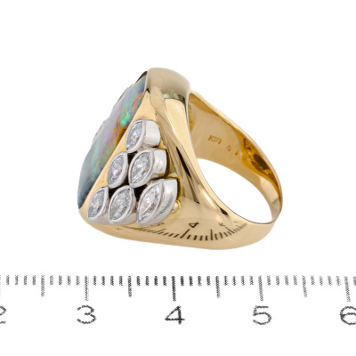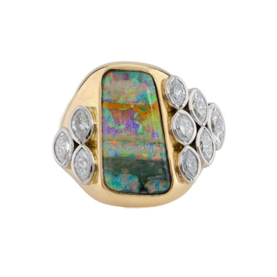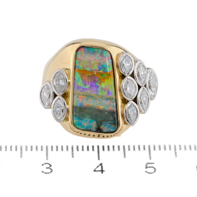 Opal and Diamond ring with centre freeform solid Natural Boulder Opal of 6.10ct and 9 marquise cut Natural Diamonds totalling 1.01ct (Estimated grading: G-H SI). 18ct yellow & white gold. Ring size: K1/4. Band width: 2.2mm - 5.8mm. Weight: 20.8g. With Certificate #422049.