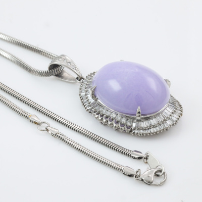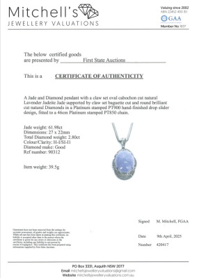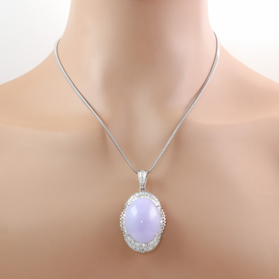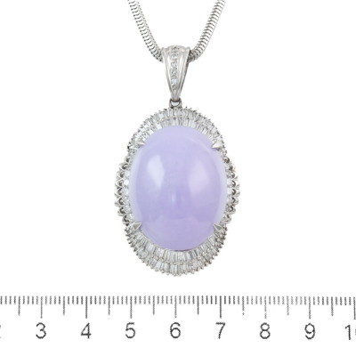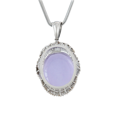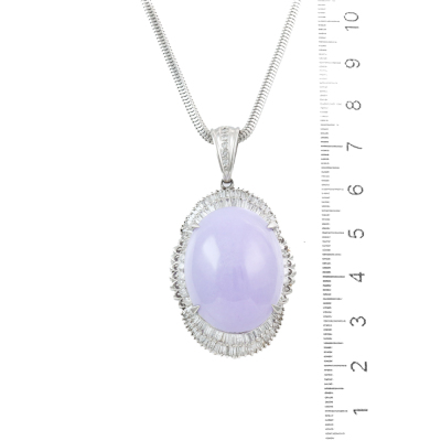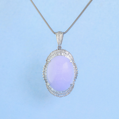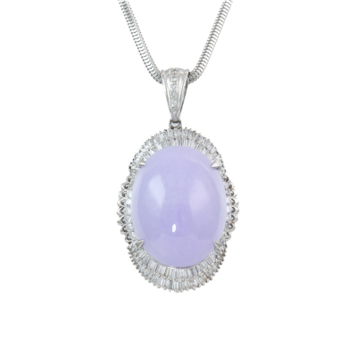 Jade and Diamond pendant with oval cabochon cut Natural Lavender Jadeite Jade - Type A of 61.98ct and round & baguette cut Natural Diamonds totalling 2.80ct (Estimated grading: H-I SI-P1). Platinum - 900 with 46cm platinum 850 chain. Weight: 39.5g. With Certificate #420417. (Pre-owned)