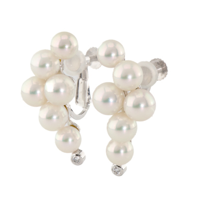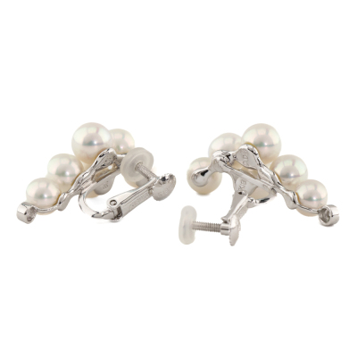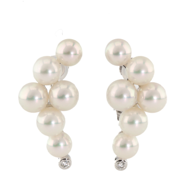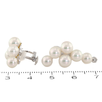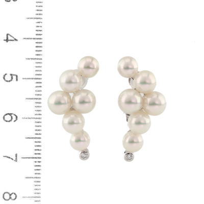 Clip-on , screw back earrings (for non pierced ears) with 12 Akoya Pearl approximately from 6.3mm - 5.3mm and 2 round Natural Diamonds totalling 0.06ct. 18ct white gold. Weight: 7.3g. (Pre-owned)
