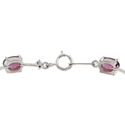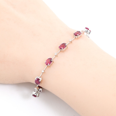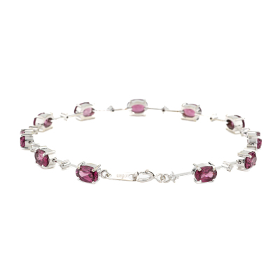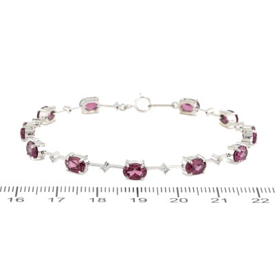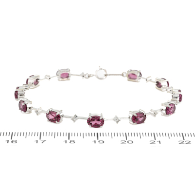 Garnet and Diamond bracelet with 11 oval shape Natural Red Garnets totalling 6.30ct and round Natural Diamonds totalling 0.15ct. 18ct white gold. Length: 18cm. Weight: 7.9g. (pre-owned)