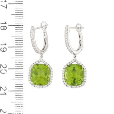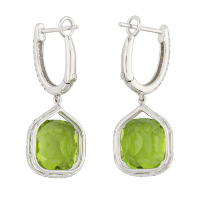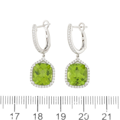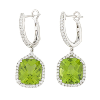 Peridot and Diamond earrings with square cushion cut checkerboard natural Peridots totalling 6.32ct and round natural Diamonds totalling 0.45ct (Estimated grading: H SI). 14ct white gold. Weight: 4.2g. (New)
