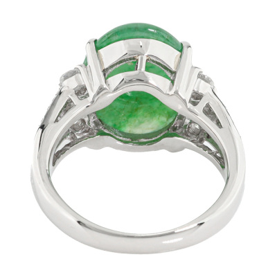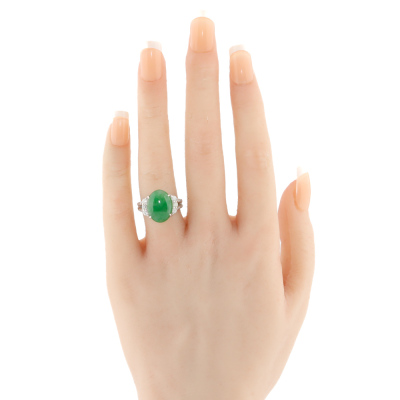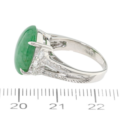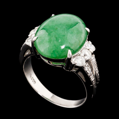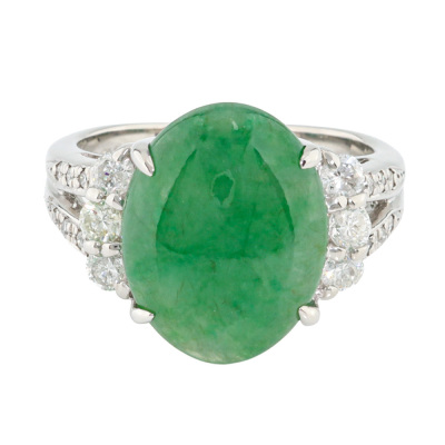 Jade and Diamond ring with oval cabochon cut Natural green Jadeite Jade - Type A of 6.38ct and round Natural Diamonds totalling 0.45ct (Estimated grading: I-J SI2-P1). Platinum - 900. Ring size L. Band width: 2.8mm - 4.2mm. Weight: 9.1g. (Pre-owned)
