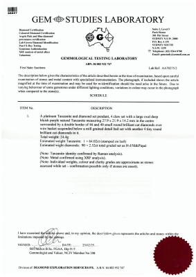 Tanzanite and Diamond pendant with oval shape Natural Tanzanite of 64.02ct and round Natural Diamonds totalling 2.52ct (Estimated grading: H-J SI-P1). Platinum-950 with 42cm 18ct white gold omega chain. Weight: 33.2g. With GSL Description Certificate #AA70275/2. (Pre-owned)