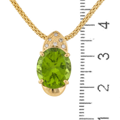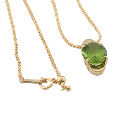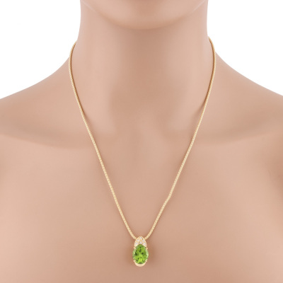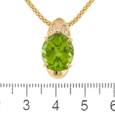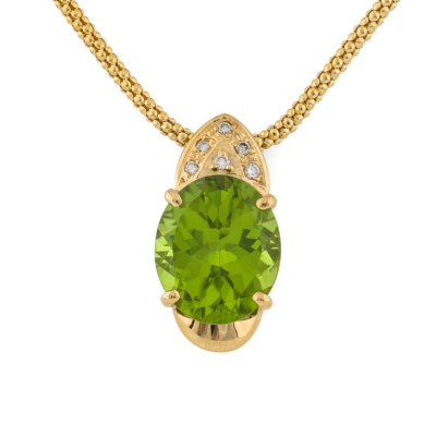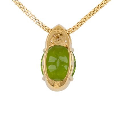 Peridot and Diamond pendant with oval shape Natural Peridot of 6.42ct and round Natural Diamonds totalling 0.06ct. 18ct yellow gold with 51cm 18ct yellow gold chain. Weight: 9.0g.