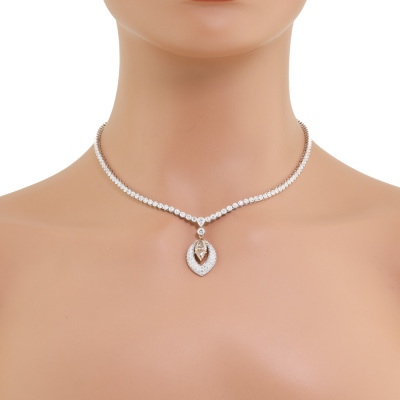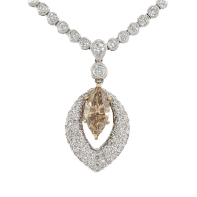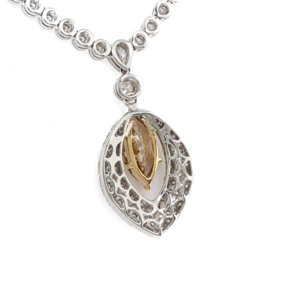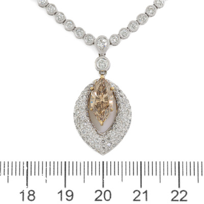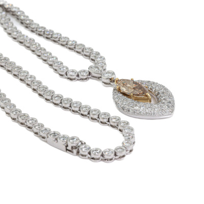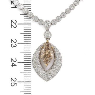 Diamond tennis necklace attached with Champagne & white Diamond pendant. With a centre marquise cut Natural Diamond of 1.63ct (Estimated grading: Champagne SI) and round Natural Diamonds totalling 4.80ct (Estimated grading: G-H SI). 18ct white gold. Length: 41cm. Weight: 24.4g. With Valuation Certificate #421804. (Pre-owned)