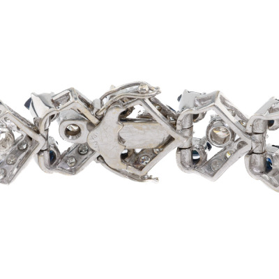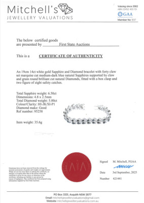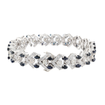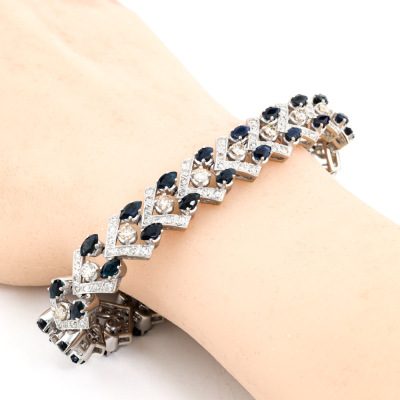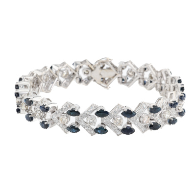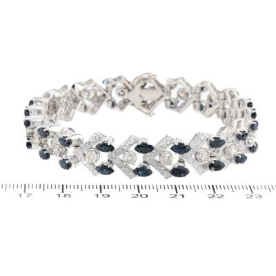 Sapphire and Diamond bracelet with 40 marquise cut Natural blue Sapphires totalling approximately 6.50cts and round Natural Diamonds totalling approximately 5.00cts (Estimated grading HI & JK SI-P1). 14ct white gold. Length 19cm. Weight: 35.6g. With Valuation #421441.