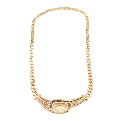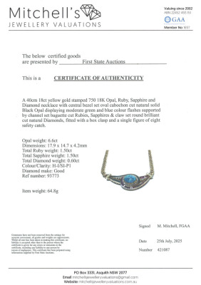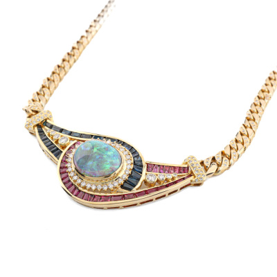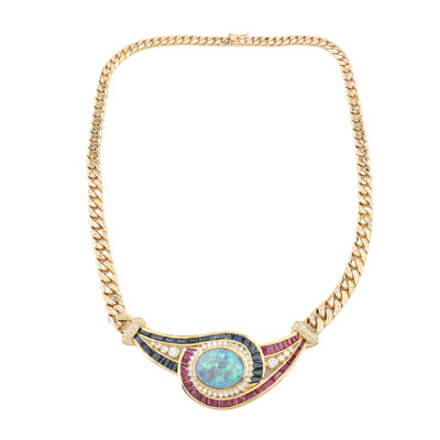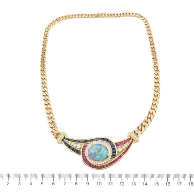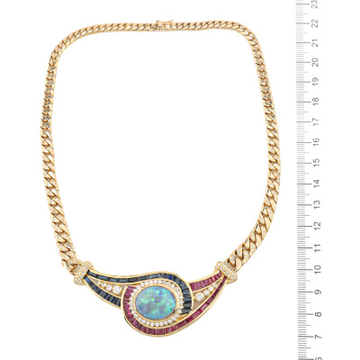 Opal, Ruby, Sapphire and Diamond necklace with oval shape cabochon cut Black Opal of 6.60ct, baguette cut Natural Rubies totalling 1.50ct, baguette cut Natural Sapphires totalling 1.50ct and round Natural Diamonds totalling 0.60ct. 18ct yellow gold. Length: 40cm. Weight: 64.8g. With Certificate #421087. (Pre-owned)
