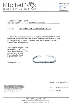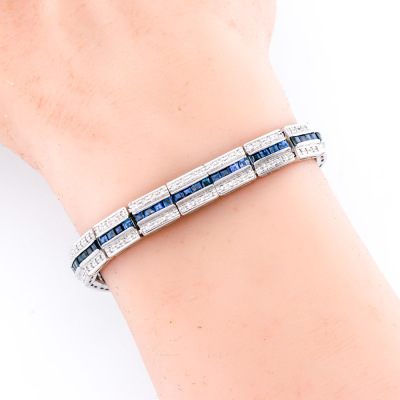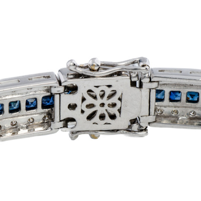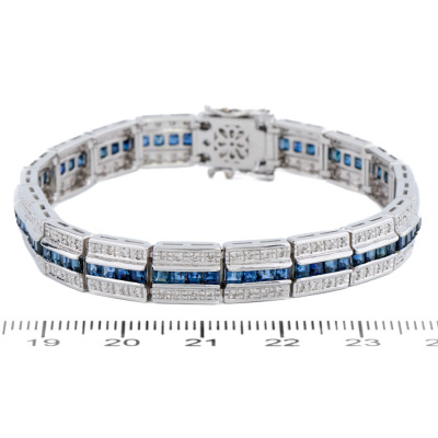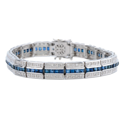 Sapphire and Diamond bracelet with carre cut Natural Blue Sapphires totalling 6.60ct and round Natural Diamonds totalling 1.00ct (Estimated grading: H-I SI). 18ct white gold. Length: 18cm. Width: 7.8mm. Weight: 27.8g. With Certificate #421442. (Pre-owned)