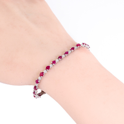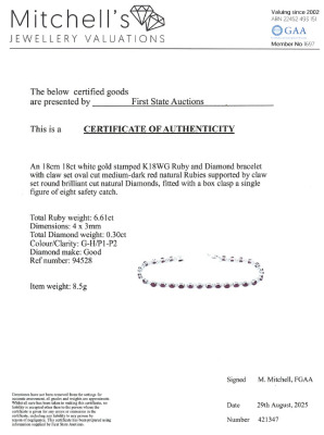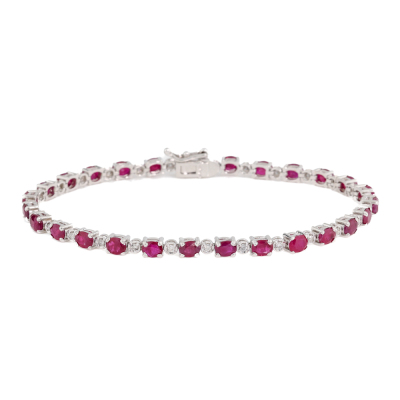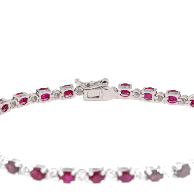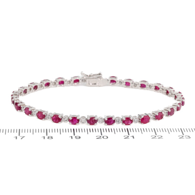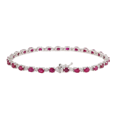 Ruby and Diamond bracelet with 27 oval shape Natural Rubies totalling 6.61ct and round Natural Diamonds totalling 0.30ct (FSA Estimated grading: G-H P1-P2). 18ct white gold. Length: 18cm. Weight: 8.5g. With Certificate #421347. (Pre-owned)
