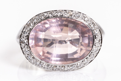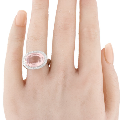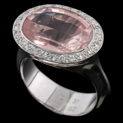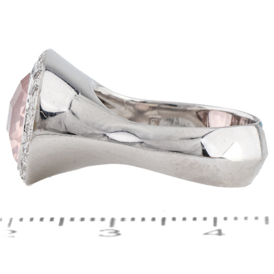 Quartz and Diamond ring with an oval checkerboard cut rose Quartz of 6.62ct and Diamonds totalling 0.31ct (Estimated grading: H SI). 18ct white gold. Ring size M. Weight 12.2g (Pre-owned)