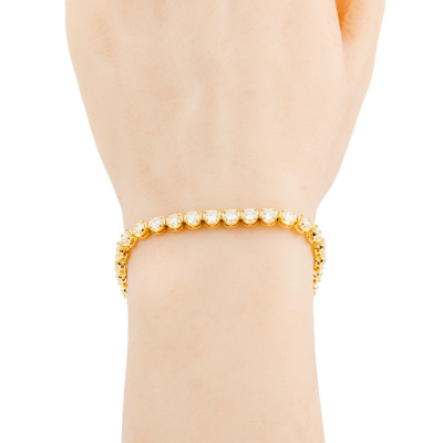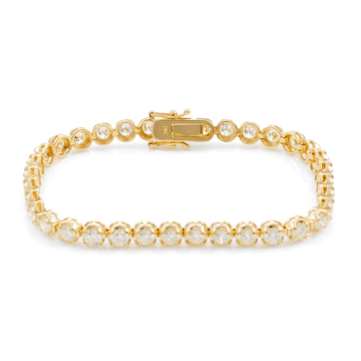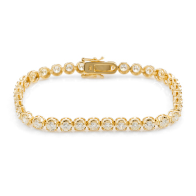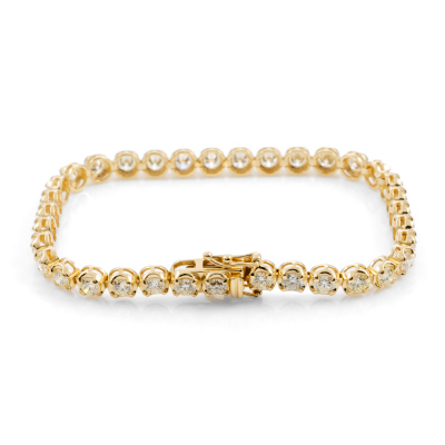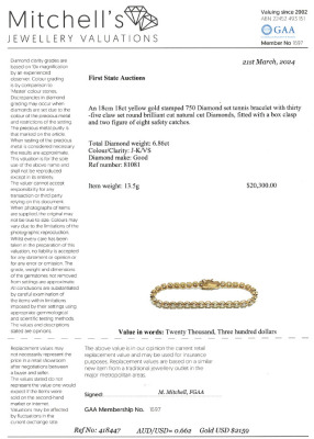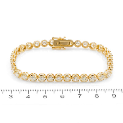 Diamond tennis bracelet with 35 round Natural Diamonds totalling 6.86ct (Estimated grading: J-K VS). 18ct yellow gold. Length: 18cm. Weight: 13.5g. With Valuation Certificate #418447. (New)