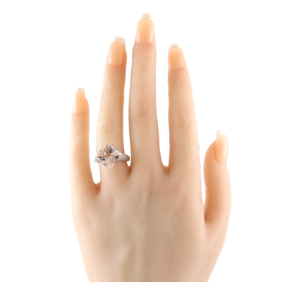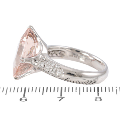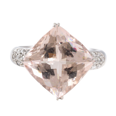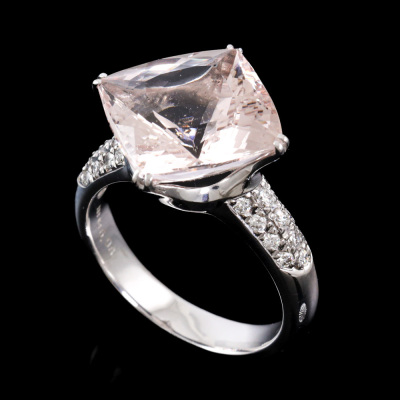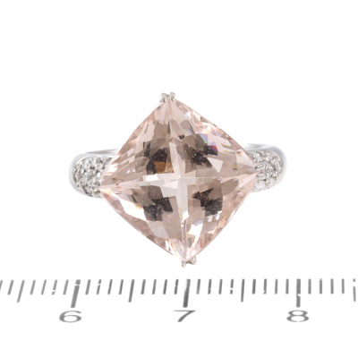 Morganite and Diamond ring with square cushion cut Natural Morganite of 6.98ct and round Natural Diamonds totalling 0.26ct. 18ct white gold. Ring size: M. Band width: 3.4mm - 4.0mm. Weight: 7.9g.