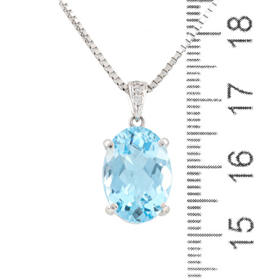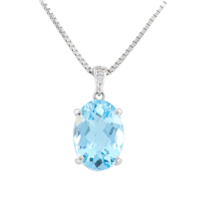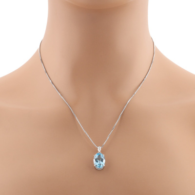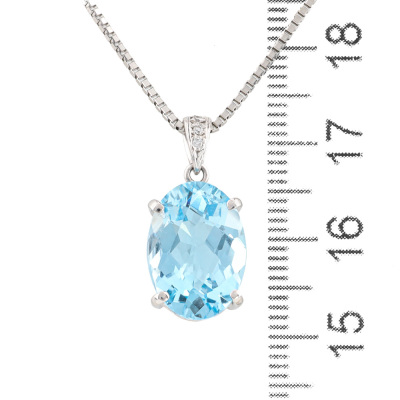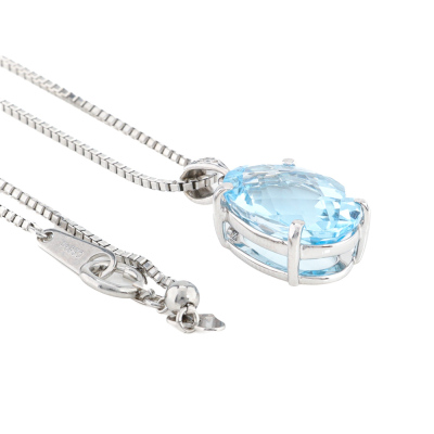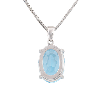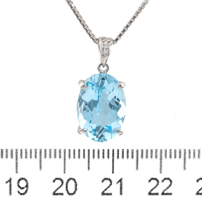 Topaz and Diamond pendant with oval shape Natural Blue Topaz of 6.98ct and round Natural Diamonds totalling 0.01ct. 18ct white gold with 45cm Platinum - 850 adjustable chain. Weight: 7.4g. (Pre-owned)
