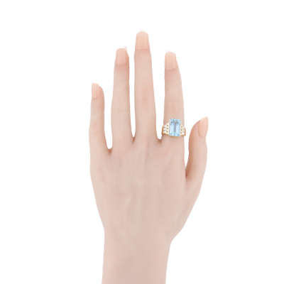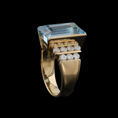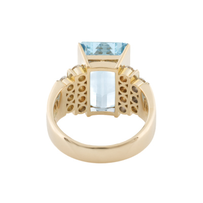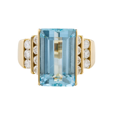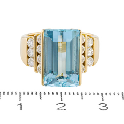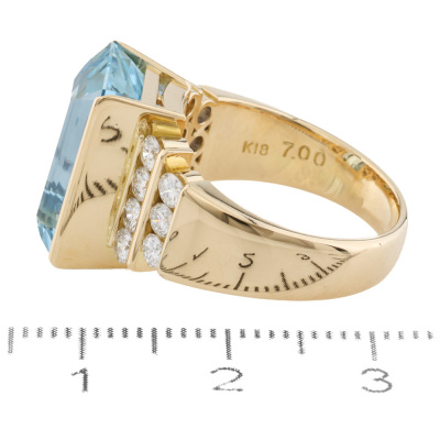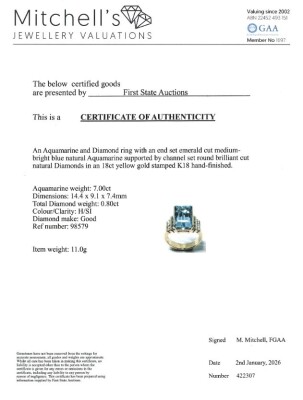Aquamarine and Diamond ring with a emerald cut Natural Aquamarine of 7.00ct and round Natural Diamonds totalling 0.80ct (Estimated grading: H SI). 18ct yellow gold. Ring size M. Band width: 4.2mm - 6.9mm. Weight: 11.0g. With Certificate #422307..