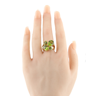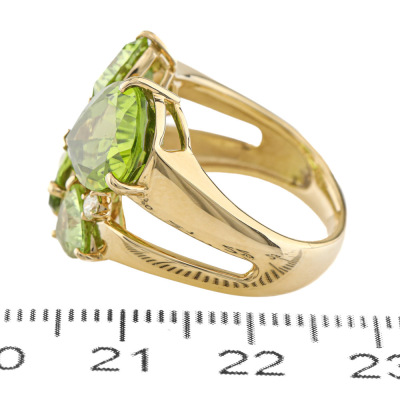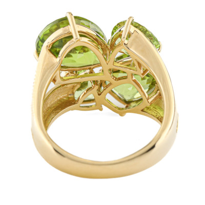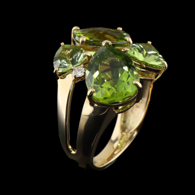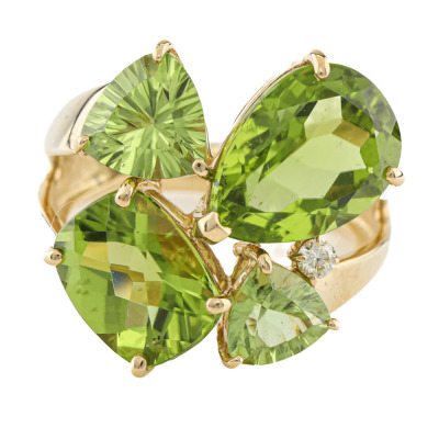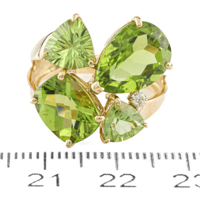 Peridot and Diamond ring with pear, cushion & trilliant cut Natural Peridot totalling 7.00ct and round Natural Diamonds totalling 0.03ct. 18ct yellow gold. Ring size L. Band width: 6.3mm - 3.1mm. Weight: 9.6g. (Pre-owned)