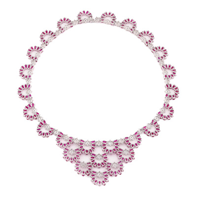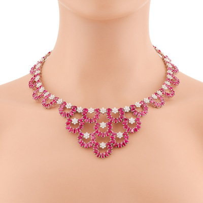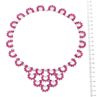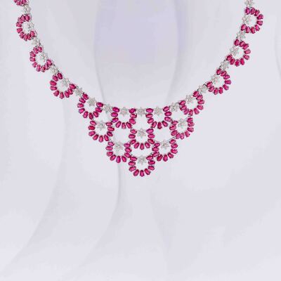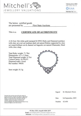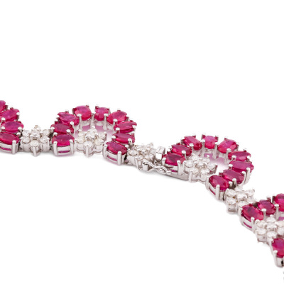 Ruby and Diamond necklace with round Natural Rubies totalling 71.70ct and round Natural Diamonds totalling 8.75ct (Estimated grading: H-I SI-P1). 18ct white gold. Inner circumference: 44.5cm. Weight: 81.5g. With Certificate #421450. (Pre-owned)
