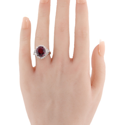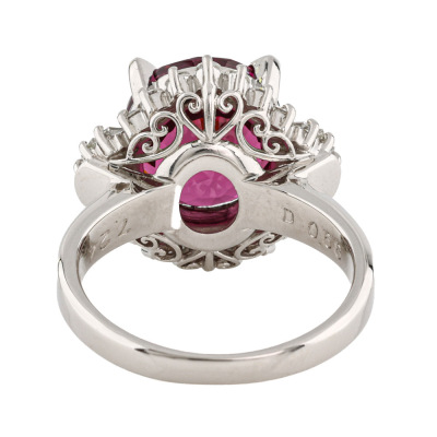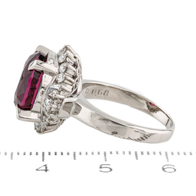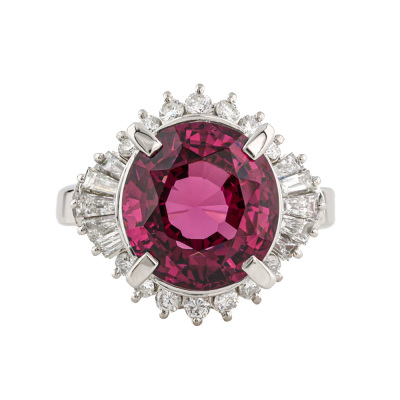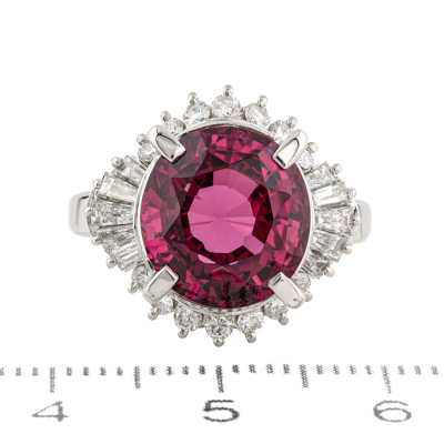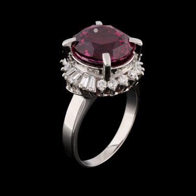 Garnet and Diamond ring with round Natural Rhodolite Garnet of 7.24ct and round & baguette cut Natural Diamonds totalling 0.68ct (Estimated grading: G-I SI-P1). Platinum - 900. Ring size L. Band width: 3.5mm - 2.1mm. Weight: 11.1g. (Pre-owned)