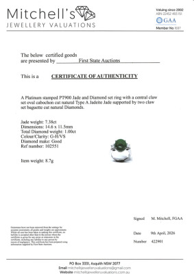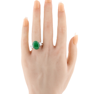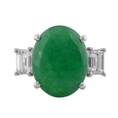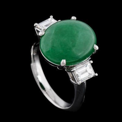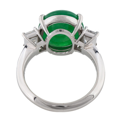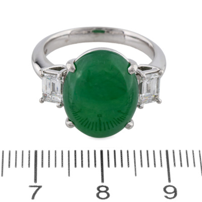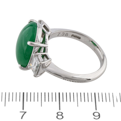 Jade and Diamond ring with centre oval cabochon cut Natural Green Jadeite Jade - Type A of 7.38ct and 2 baguette cut Natural Diamonds totalling 1.00ct (Estimated grading: G-H VS). Platinum - 900. Band width: 2.7mm - 2.8mm. With Certificate #422901.