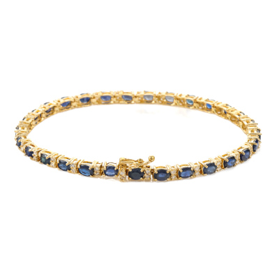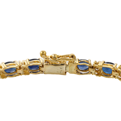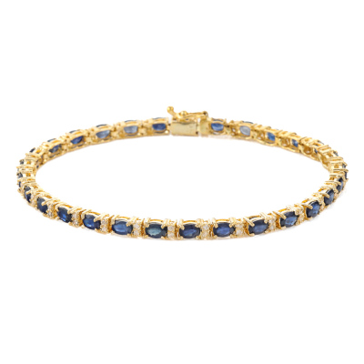 Sapphire and Diamond bracelet with oval shape Natural Blue Sapphires totalling 7.44ct and round Natural Diamonds totalling 0.43ct (Estimated grading: GHI SI-P1). 18ct yellow gold. Length: 18cm. Weight: 11.1g.