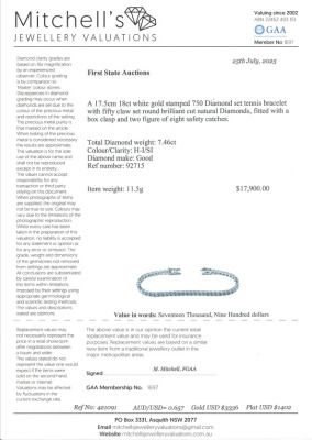 Diamond tennis bracelet with 50 round Natural Diamonds totalling 7.46ct (Estimated grading: H-I SI). 18ct white gold. Length: 17.5cm. Weight: 11.5g. With Valuation Certificate #421091. (New)
