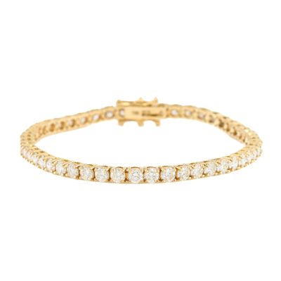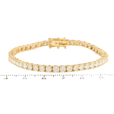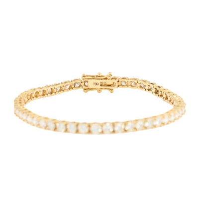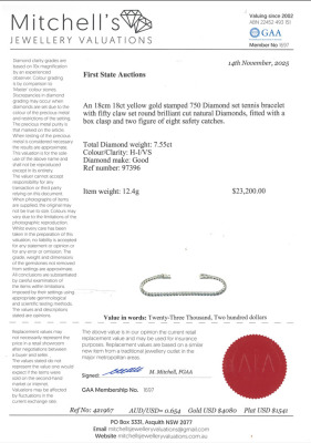 Diamond tennis bracelet with 50 round Natural Diamonds totalling 7.55ct (Estimated grading: H-I VS). 18ct yellow gold. Length: 18cm. Weight: 12.4g. With Valuation Certificate #421967. (New)