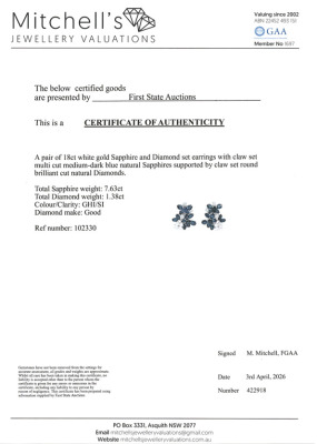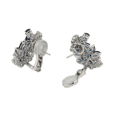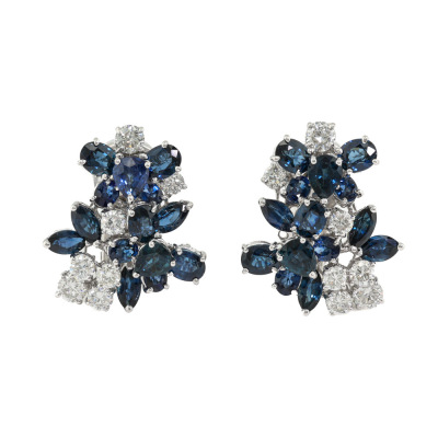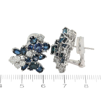 Clip-on earrings (for pierced ears) with multi-cut Natural blue Sapphires totalling 7.63ct and round Natural Diamonds totalling 1.38ct (Estimated grading: GHI SI). 18ct white gold. With Certificate #422918.