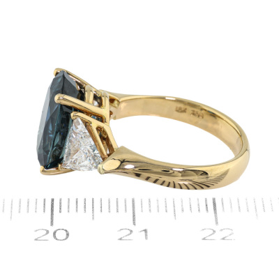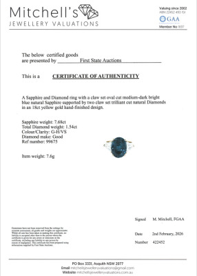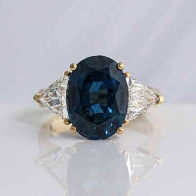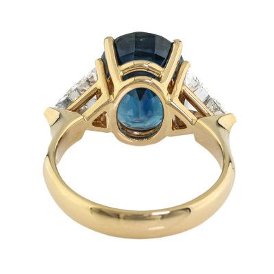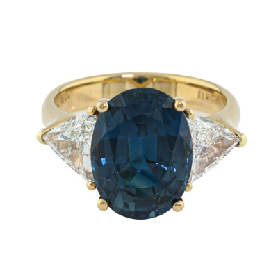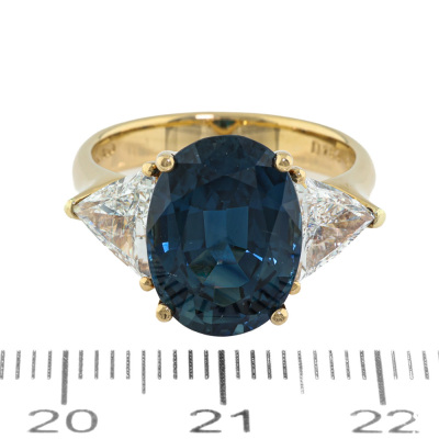 Sapphire & Diamond ring with centre oval shape Natural Blue Sapphire of 7.68ct and 2 trilliant cut Natural Diamonds totalling 1.54ct (Estimated grading: G-H VS). 18ct yellow gold. Ring size N3/4. Band width: 3.6mm - 3.2mm. Weight: 7.6g. With Certificate #422452. (Pre-owned).