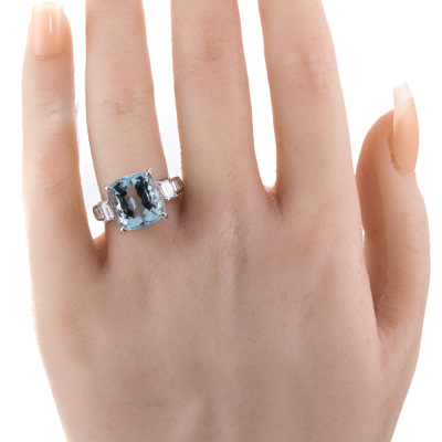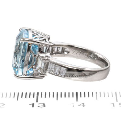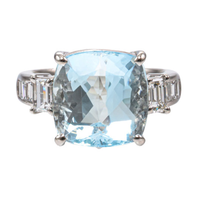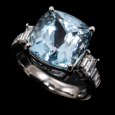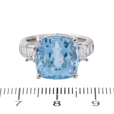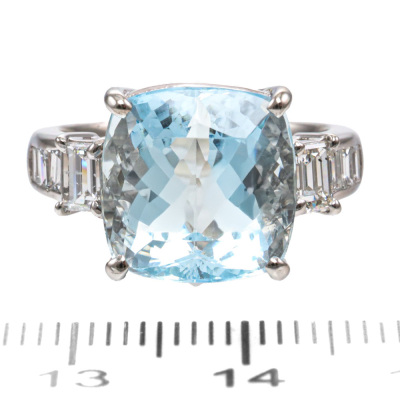 Aquamarine and Diamond ring with centre cushion cut Natural Aquamarine of 7.71ct and baguette cut Natural Diamonds totalling 0.77ct (Estimated grading: G VS). Platinum - 900. Ring size: L 3/4. Band width: 3.2mm -4.0mm. Weight: 9.5g. (Pre-owned)