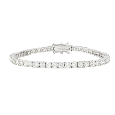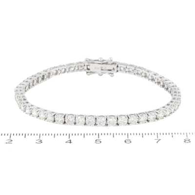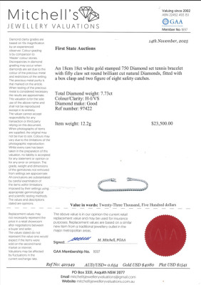Diamond tennis bracelet with 50 round Natural Diamonds totalling 7.73ct (Estimated grading: H-I VS). 18ct white gold. Length: 18cm. Weight: 12.2g. With Valuation Certificate #421949. (New)