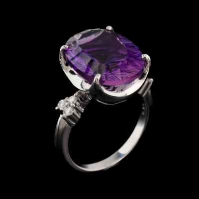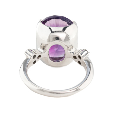 Amethyst and Diamond ring with oval shape Natural Amethyst of 7.74ct and round Natural Diamonds totalling 0.16ct. 18ct white gold. Ring size K3/4. Band width: 2.1mm - 2.6mm. Weight: 8.5g. (Pre-owned)